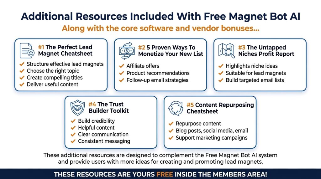 Along with the core Free Magnet Bot AI system, the creator also includes several training resources designed to help users understand how to create lead magnets and start building an email list.
